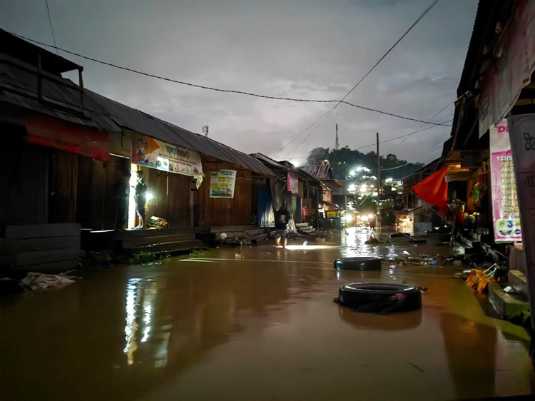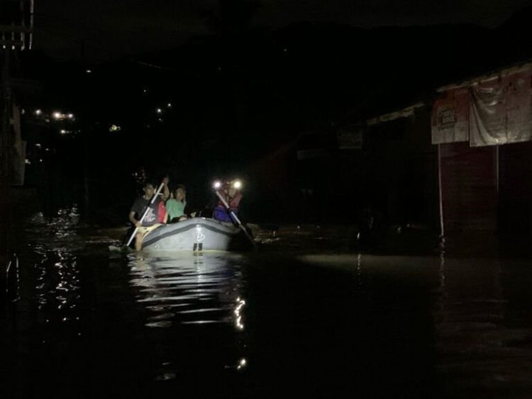 Makassar, Nawacita | Banjir menerjang Makale, Kabupaten Tana Toraja, Sulawesi Selatan, akibat sungai meluap usai diguyur hujan dengan intensitas deras. Warga yang berada di bantaran sungai dievakuasi oleh Tim SAR, Minggu (25/2/2024) malam.