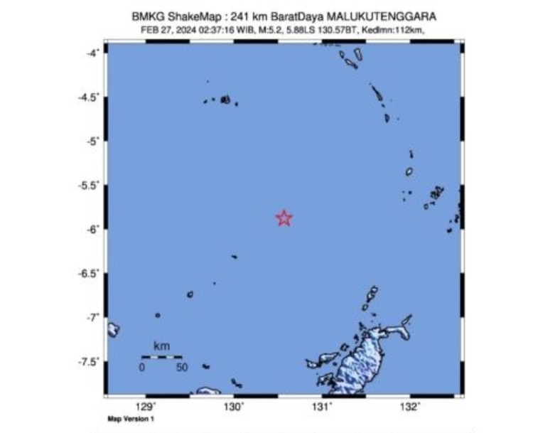 Gempa tektonik berkekuatan magnitudo M 5,4 yang mengguncang Kabupaten Maluku Tengah, Maluku, pada Selasa (27/2/2024) pagi dini hari.