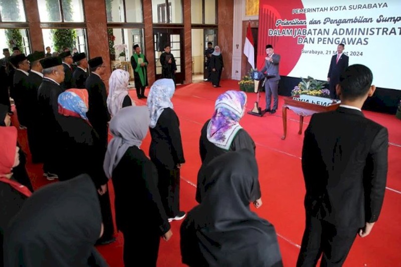 Surabaya, Nawacita – Pemerintah Kota (Pemkot) Surabaya kembali menggelar pelantikan pejabat, di lobby lantai 2 Balai Kota, Kamis (21/3/2024). Pejabat pemkot yang dilantik pada hari ini, adalah untuk mengisi jabatan sebagai administrator dan pengawas di kelurahan dan kecamatan.