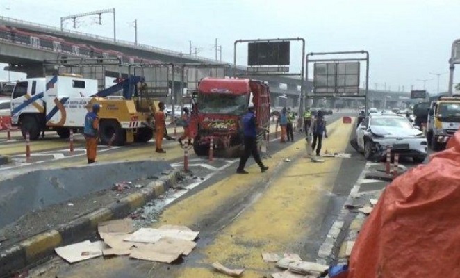 “Selanjutnya truk kuning mengebut dan melewati mobil Brio dan Xpander lanjut mengebut masuk gardu 3 dan menabrak mobil Isuzu pick up Z-8445-AH sampai terpental ke gardu 5. Kemudian menabrak mobil Hyundai putih B-1061-SPW selanjutnya berturut-turut menabrak mobil Box putih D-8633-YR dan truk kuning terbalik,” Tulis TMC Polda Metro.