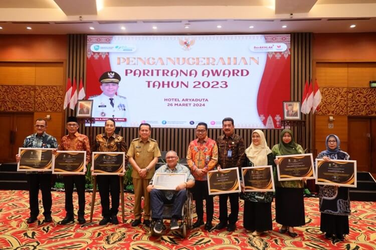 Palembang, Nawacita | Pj Gubernur Sumsel, Agus Fatoni menyerahkan Penghargaan Paritrana (Paritrana Award) Tahun 2023 kepada Para pemenang yang terpilih melalui seleksi oleh Tim Penilai yang diketuai Asisten I Bidang Pemerintahan dan Kesra Drs H Edward Chandra, MH. Paritrana Award merupakan Penghargaan Jaminan Sosial Ketenagakerjaan Tingkat Provinsi.