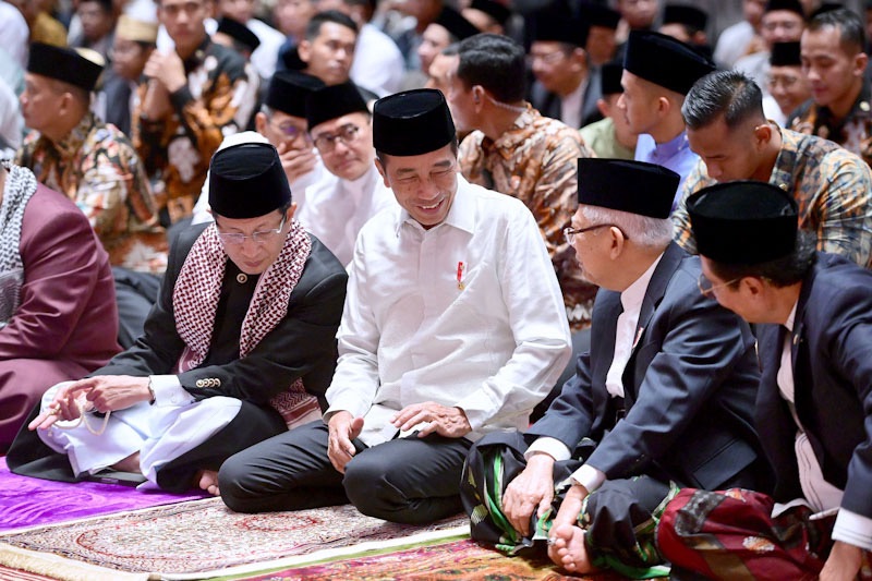 Berdasarkan pantauan, Presiden dan Wapres memasuki ruang utama Masjid Istiqlal bersamaan sekitar pukul 06.50 WIB. Presiden tampak mengenakan kemeja putih dengan celana panjang gelap, sedangkan Wapres mengenakan kemeja Muslim putih dipadukan dengan jas dan bawahan sarung.