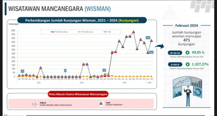 Yusniar menuturkan dibandingkan dengan Februari 2023, kunjungan wisman mengalami peningkatan secara signifikan yaitu dari 33 kunjungan wisman menjadi 471 kunjungan wisman atau mengalami peningkatan sebesar 1.327,27 persen.