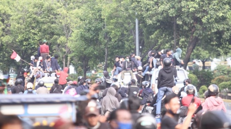 Massa kondusif, petugas keamanan dan kepolisian hanya memantau. Massa tetap aman, petugas keamanan dan kepolisian hanya melakukan pemantauan.