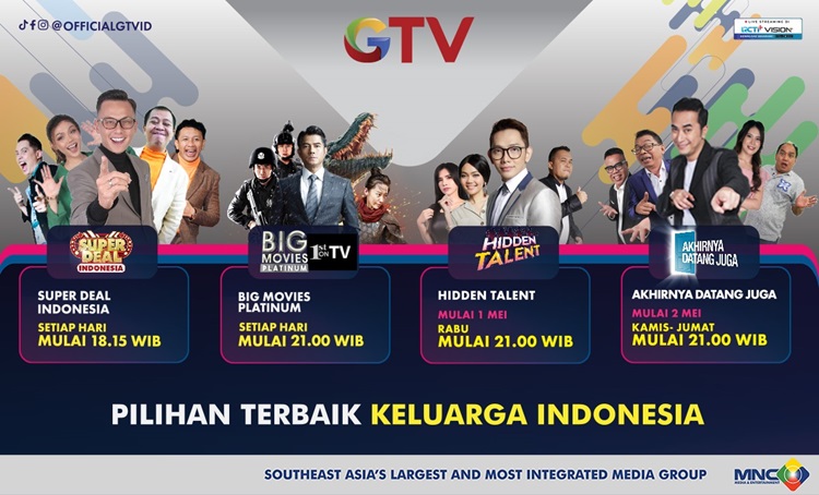 Juaranya gameshow seru yang hadiahnya real no fake! Andhika Pratama, Edric Tjandra, Gilang Gombloh dan Erick Estrada memang selalu siap bikin kaya rame-rame dengan bagi-bagi hadiah total ratusan juta di “SUPER DEAL INDONESIA” yang akan tayang setiap hari pukul 18.15 WIB. Lanjut dengan kumpulan video viral yang akan temani makan malammu di di “KV+62” setiap hari pukul 20.15 WIB. Kamu juga bisa Lepas penatmu ditemani ketegangan dan serunya deretan film first on tv di “BIG MOVIES PLATINUM” setiap hari pukul 21.00 WIB.