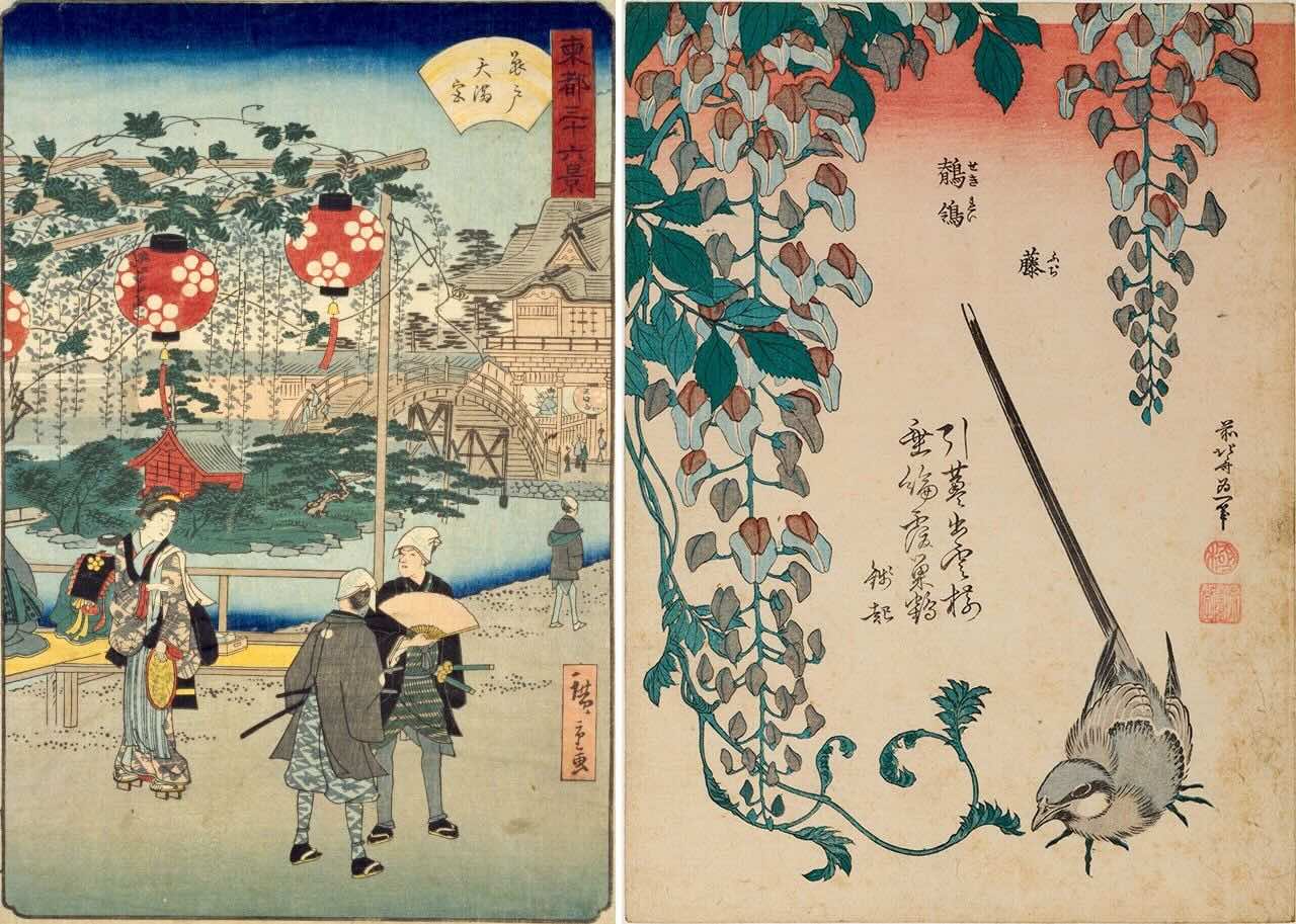 Wisteria (fuji) adalah bunga yang sangat dikagumi yang mekar pada bulan April, dengan lokasi yang berbeda menjadi terkenal dengan pemandangan bunga. Salah satu yang paling terkenal di ibu kota Edo adalah Kuil Kameido Tenjin, yang membanggakan sejumlah besar tanaman yang digantung di sepanjang teralis. Sebuah bagian dari buku panduan terkenal untuk melihat bunga, Edo meisho hanagoyomi, dengan fasih menggambarkan bagaimana wisteria yang mekar, yang tercermin di permukaan kolam di kuil, tampak mengubah air menjadi ungu. Orang-orang saat ini masih dapat menikmati pemandangan dan aroma wisteria Kameido Tenjin di fuji matsuri kuil, yang diadakan setiap tahun ketika sekitar 50 wisteria di lapangan mekar.