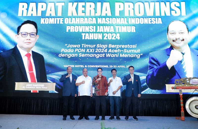 Surabaya, Nawacita – 29 APRIL 2024 – Penjabat (Pj.) Gubernur Jawa Timur Adhy Karyono membuka Rapat Kerja Provinsi (Rakerprov) Komite Olahraga Nasional Indonesia (KONI) Jawa Timur Tahun 2024 di Harris Hotel and Convention Surabaya, Senin (29/4).