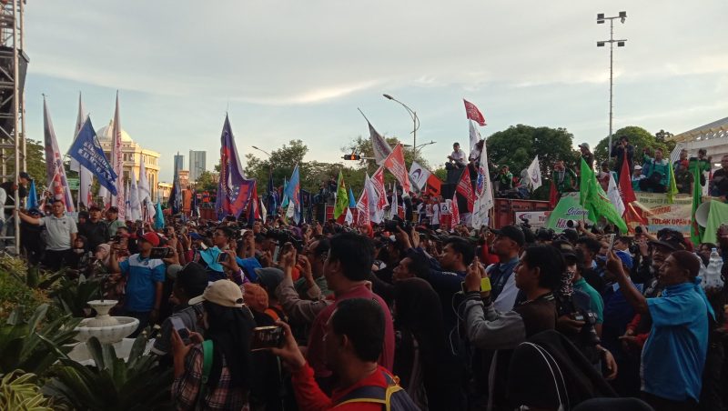 “Ini adalah hari kalian para buruh, kami sabagai Pemerintah Jawa Timur memberilan selamat bagi kalian untuk merayakan Hari Buruh Internasional, Salam buruh, May Day May Day,” teriak Adhy.