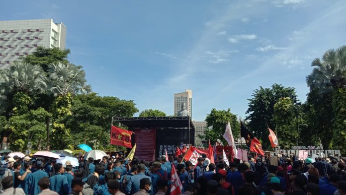 “Saya dan 20 Mahasiswa lainnya menyuarakan, Hak Cipta Kerja, dan kita menolak sistem outsourcing,” Jelas Laskar.