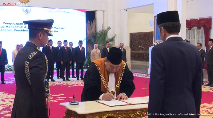 Jakarta, Nawacita | Presiden Jokowi menyaksikan pengucapan sumpah Suharto sebagai Wakil Ketua Mahkamah Agung (MA) Bidang Non Yudisial, di Istana Negara, JakaSuhartorta (15/5/2024).