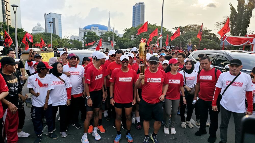 Selanjutnya, Sekjen Hasto Kristiyanto terlihat memegang Obor Api Perjuangan sambil memimpin rombongan.