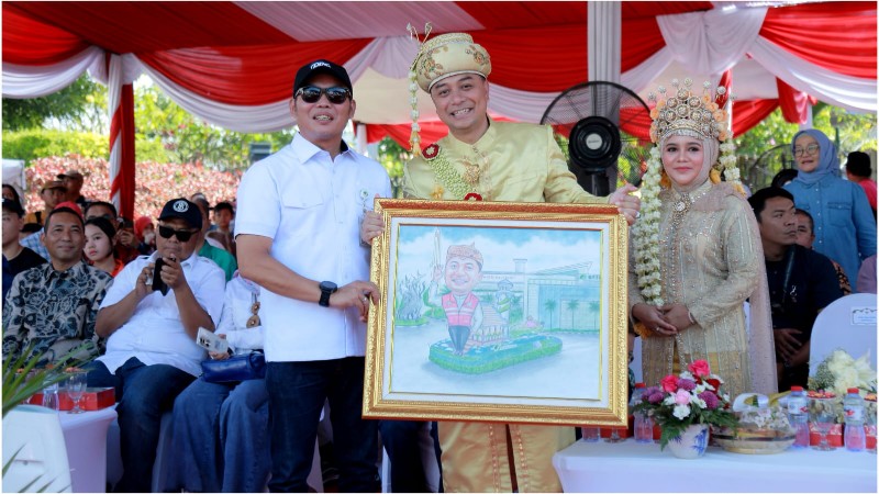 Di garis start sebelum keberangkatan, insan BPJS Ketenagakerjaan bersama mobil hiasnya, Hadi Purnomo menyerahkan cindera mata berupa lukisan karikatur kepada Walikota Surabaya Eri Cahyadi dan istri.