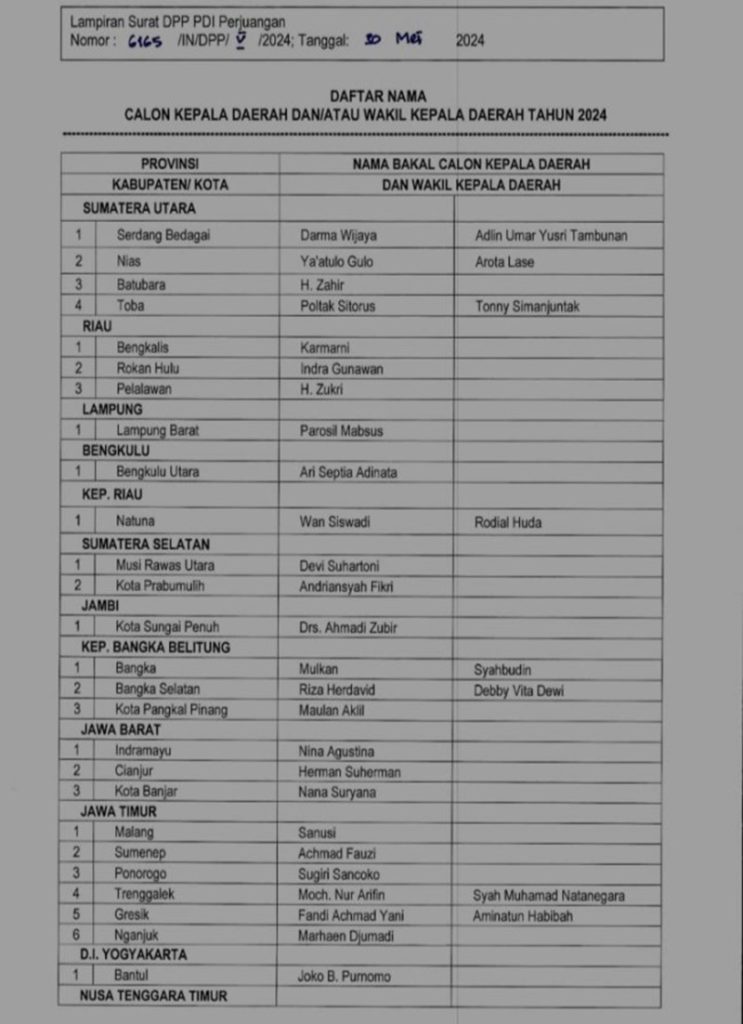 Setelah PKB mengumumkan nama-nama calon kepala daerah yang mendapatkan rekom untuk maju dalam kontestasi pilkada 2024, kini giliran PDI Perjuangan yang merilis peraih rekom dari Partai Banteng tersebut. Ada 58 calon walikota/bupati dan 3 Calon gubernur yang mendapatkan rekom.