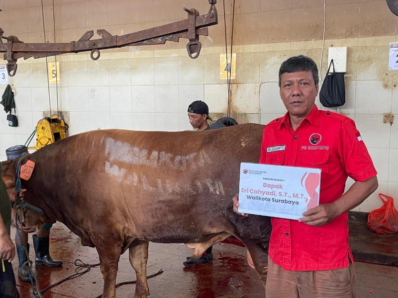Wali Kota Eri Cahyadi, yang juga Wakil Ketua DPD PDI Perjuangan Jawa Timur, hadir di RPH Surabaya sebelum pemotongan hewan kurban. Eri didampingi istri, Rini Indriyani, menyerahkan secara simbolis hewan kurban kepada PDI Perjuangan Kota Surabaya.