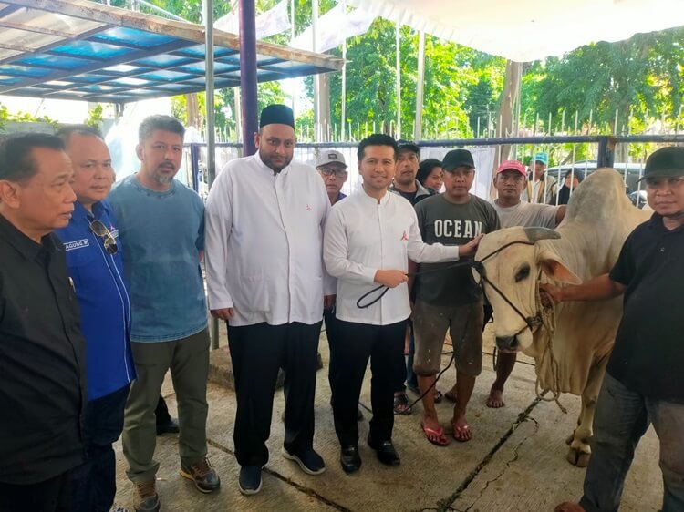 Secara simbolis penyerahan sapi dan kambing dilakukan Ketua DPD Partai Demokrat Jatim Emil Elestianto Dardak, disaksikan Bendahara Umum DPP Partai Demokrat Renville Antonio, Sekretaris DPD Partai Demokrat Jatim Reno Zulkarnen dan Bendahara Umum DPD Partai Demokrat Jatim Dr. Agung Mulyono.
