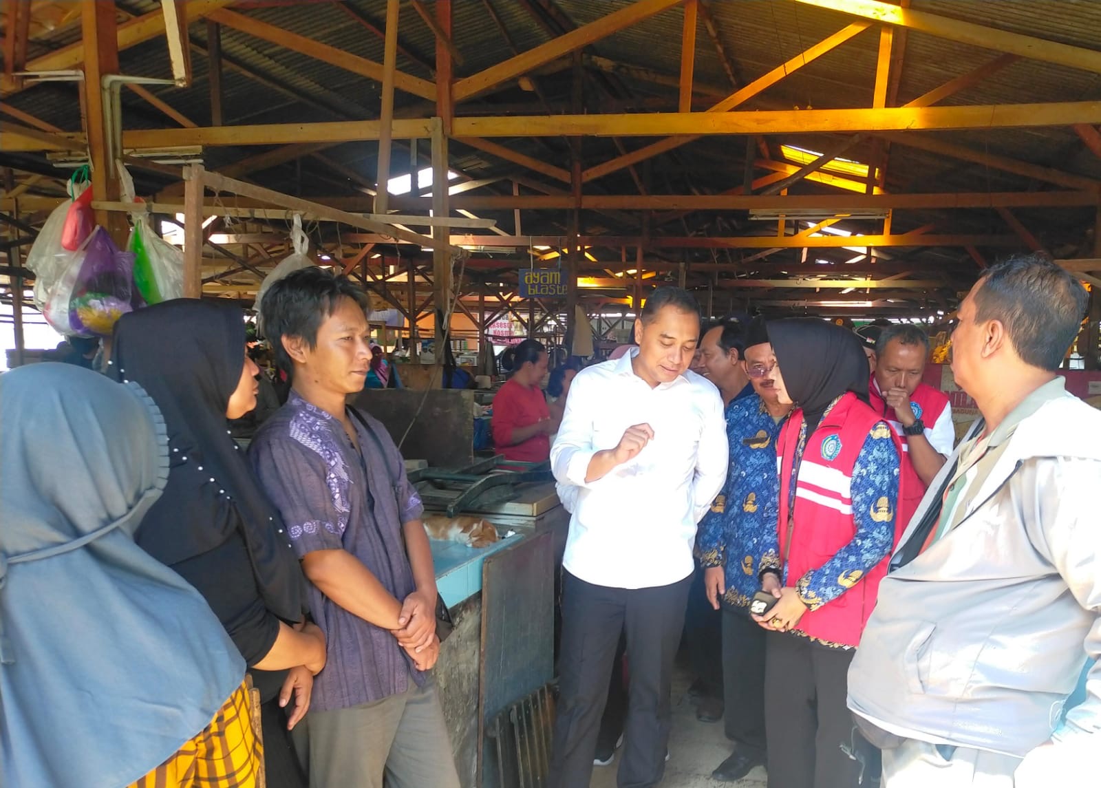 “Saya lihat pasar ini, setidaknya ada harus ada TPID (Tim Pengendalian Inflasi Daerah), ada stan-stan yang kosong itu bisa dikasih TPID, jadi pasar yang ada TPID itu menyediakan beras dan macem-macem yang hanya boleh diambil oleh para pedagang, sehingga pedagang ini bisa mendapatkan harga kulakan (beli) yang tidak mahal, jadi pedagang ga usah beli dengan harga yang mahal, pedagang juga ga perlu beli jauh-jauh, cukup ambil di PTID, nanti harganya sama dengan yang dia ambil di luar, atau bahkan bisa lebih murah. Jadi kalaupun sembako itu lagi naik-naiknya, harga di PTID tetap stabil dan bisa lebih murah.” ucap Eri Cahyadi. (Gio)
