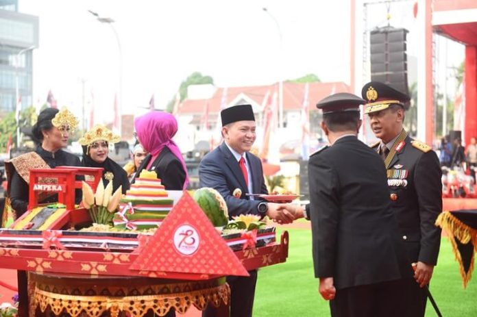 Palembang, Nawacita | Pj Gubernur Sumsel Elen Setiadi menghadiri Upacara dan Syukuran Peringatan Hari Bhayangkara ke-78 di Halaman Upacara Mapolda Sumsel, Jl. Jend Sudirman Km. 4,5 Palembang, Senin (1/7/2024).