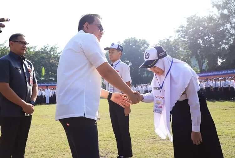 Surabaya, Nawacita | Pj Gubernur Jatim Adhy Karyono memimpin deklarasi gerakan anti perundungan pada pembukaan Masa Pengenalan Lingkungan Sekolah (MPLS) Tahun 2024 Jenjang SMA, SMK dan SLB negeri/swasta, di SMK Negeri 5 Surabaya, Senin (15/7/2024).
