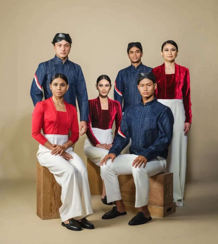 Sementara, seragam wanita menampilkan atasan Kebaya Kutubaru bercorak merah yang dilengkapi dengan celana putih.