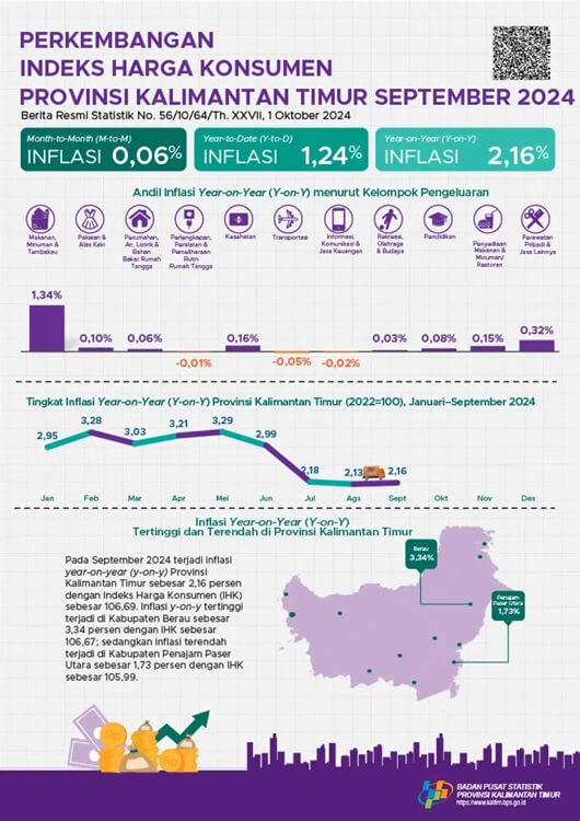 Samarinda, Nawacita | Badan Pusat Statistik Provinsi Kalimantan Timur (BPS Kaltim) mencatat adanya inflasi di wilayah ini pada bulan September 2024 sebesar 2,16 persen atau terjadi kenaikan Indeks Harga Konsumen (IHK) dari 104,43 pada September 2023 menjadi 106,69 pada September 2024.