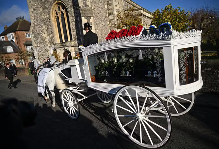Jenazah Payne tampak tiba di gereja St Mary dengan mobil yang ditarik kereta dan kuda putih yang membawa bunga. Tertulis sebuah kata anak dan ayah.