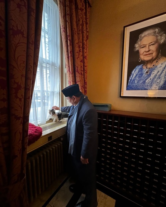 Ada dua foto yang diperlihatkan Prabowo di salah satu ruangan di dalam Downing Street Nomor 10. Foto pertama menunjukkan Prabowo tengah mengelus kepala kucing berkelir abu-abu dan putih itu.