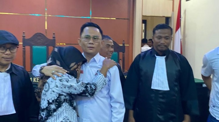 Supriyani menangis usai mendengar vonis bebas hakim. Para rekannya sesama guru yang hadir dalam persidangan memberikan selamat sambil memeluk Supriyani.