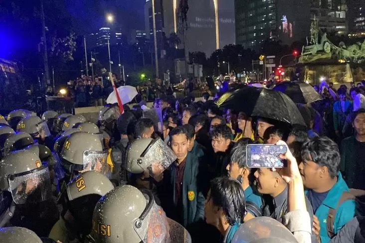 Hal itu bermula ketika mahasiswa enggan membubarkan diri hingga batas waktu penyampaian pendapat. Polisi mengimbau peserta aksi membubarkan diri. Namun, imbauan itu justru direspons oleh peserta aksi dengan berdiam diri di lokasi aksi. Hingga pukul 22.30 Mahasiswa belum kunjung bubar.