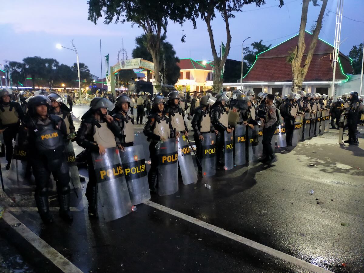 Sekitar kurang lebih pukul 18.00 pihak Pengendalian Massa (Dalmas) Polda Jatim pun menerjunkan para anggotanya untuk memukul mundur para pengunjuk rasa.