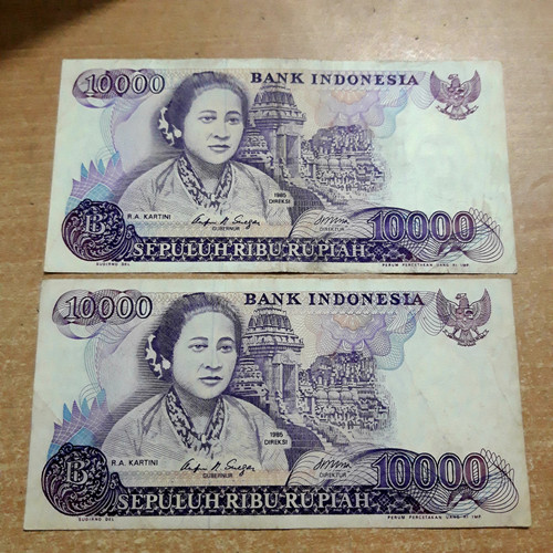 Mata uang tersebut adalah uang kertas terbitan tahun 1952 dengan pecahan 5 Rupiah (Rp 5) lengkap dengan gambar wajah RA Kartini rambutnya disanggul dan memakai kebaya. Kemudian pada tahun 1985 kembali diterbitkan uang pecahan Rp 10.000 dengan gambar wajah Kartini yang tak jauh beda.