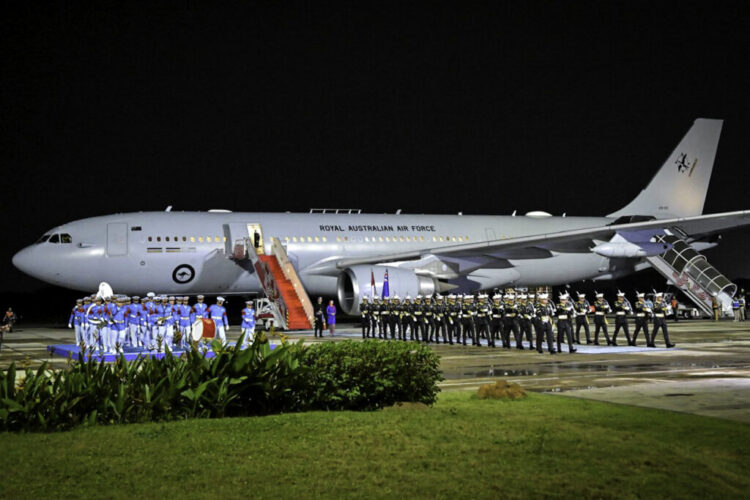 Setibanya di Pangkalan TNI AU Halim Perdanakusuma, Jakarta, PM Albanese disambut pasukan kehormatan yang telah berjajar di bawah tangga pesawat untuk memberikan penghormatan resmi.