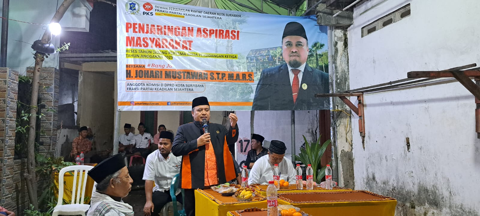 Surabaya, Nawacita – Anggota Komisi D DPRD Kota Surabaya dari Fraksi PKS, Johari Mustawan, S.T.P., M.A.R.S., menggelar kegiatan penjaringan aspirasi masyarakat di kawasan Tambak Mayor, Kecamatan Asemrowo, pada Senin (19/5). Kegiatan ini menjadi wadah bagi warga untuk menyampaikan berbagai keluhan dan harapan, khususnya terkait persoalan Sistem Penerimaan Murid Baru (SPMB), layanan BPJS Kesehatan, serta kebutuhan ruang terbuka bagi anak-anak.