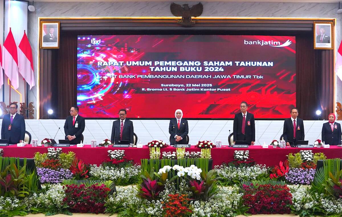 SURABAYA, Nawacita – PT Bank Pembangunan Daerah Jawa Timur Tbk (Bank Jatim) telah melaksanakan Rapat Umum Pemegang Saham (RUPS) Tahunan Tahun Buku 2024 di Kantor Pusat Jl Basuki Rahmat Surabaya. Hadir langsung dalam RUPS tersebut Gubernur Jawa Timur KhofifahIndar Parawansa mewakili Pemerintah Provinsi Jawa Timur sebagai pemegang saham pengendali beserta seluruh dewan komisaris serta direksi Bank Jatim.
