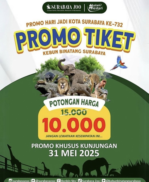 Surabaya, Nawacita.co – Kabar gembira bagi warga Surabaya dan sekitarnya! Dalam rangka memperingati Hari Jadi Kota Surabaya yang ke-732, Kebun Binatang Surabaya (KBS) memberikan penawaran spesial yang sayang untuk dilewatkan.