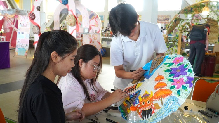 IDE+ 2025 bukan sekadar pameran visual. Salah satu kegiatan unggulan adalah Umbrella Painting Workshop bertema “Nusantara”, di mana mahasiswa belajar teknik pewarnaan dengan acrylic pen di atas media payung.