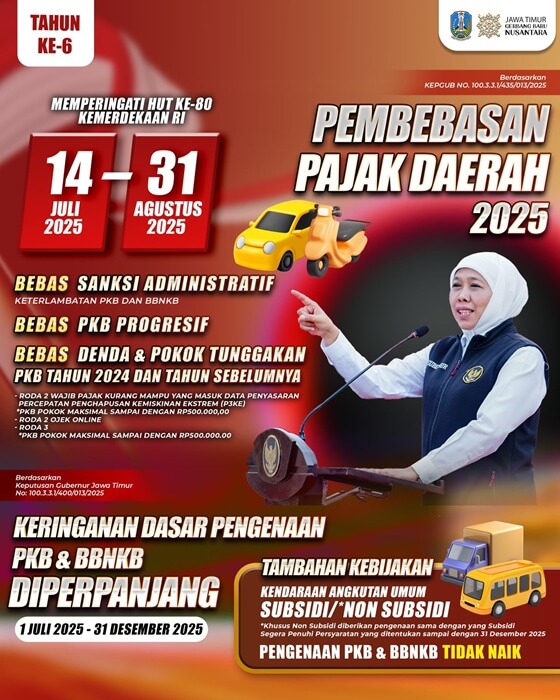 Surabaya, Nawacita.co – Pemerintah Provinsi Jawa Timur kembali menggulirkan program pemutihan pajak kendaraan bermotor sebagai bentuk konsistensi dalam meringankan beban masyarakat. program ini diadakan dalam rangka menyambut HUT ke-80 Republik Indonesia dan berlaku mulai 14 Juli hingga 31 Agustus 2025.