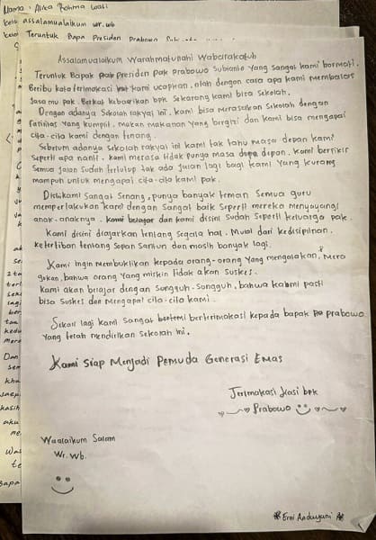 Menutup suratnya, Erni menyampaikan terima kasih kepada Presiden Prabowo dan menyatakan kesiapannya untuk menjadi generasi penerus bangsa untuk mewujudkan cita-cita Indonesia Maju.