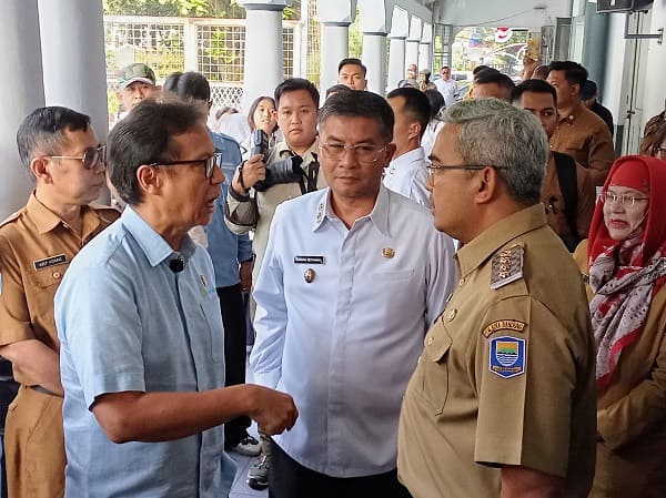 Capt: Momen saat Wakil Gubernur Jawa Barat, Erwan Setiawan bersama Walikota Bandung, Muhammad Farhan mendampingi Menteri Kesehatan, Budi Gunadi meninjau CKG khusus siswa di SMPN 5 Kota Bandung. Foto: Nawacita/Niko.