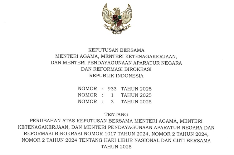 SKB ini merupakan perubahan atas SKB sebelumnya, yakni Nomor 1017 Tahun 2024, Nomor 2 Tahun 2024, dan Nomor 2 Tahun 2024 tentang Hari Libur Nasional dan Cuti Bersama Tahun 2025. Perubahan ini secara resmi menetapkan tambahan cuti bersama pada tanggal 18 Agustus 2025, sehari setelah peringatan Hari Kemerdekaan Indonesia.