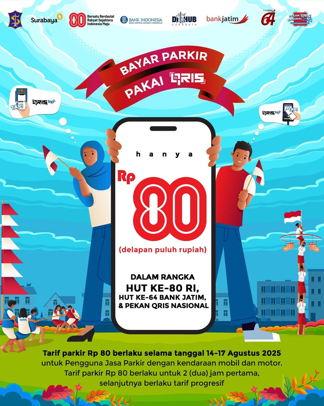 Nawacita – Dalam rangka Hari Kemerdekaan Republik Indonesia ke-80 tahun dan Hari Ulang Tahun Bank Jatim ke-64 tahun serta dalam rangka pekan QRIS Nasional, Dinas Perhubungan Kota Surabaya memperlakukan tarif parkir khusus Rp80 untuk parkir di beberapa lokasi Kota Pahlawan.