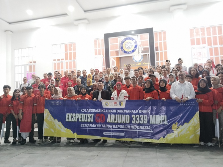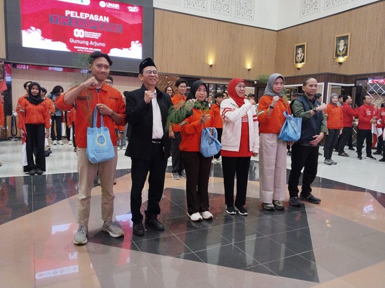 Gubernur Jawa Timur, sekaligus Ketua Ikatan Alumni Airlangga (IKA), Khofifah Indar Parawansa, turut melepas Tim Wanala UNAIR yang akan melakukan ekspedisi di Gunung Arjuna.