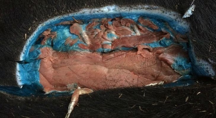 Hal ini memicu pernyataan peringatan tentang potensi kontaminasi terhadap hewan. Ini diungkap Dan Burton, pemilik perusahaan pengendalian satwa liar, di mana daging di tubuh babi hutan tersebut berwarna biru yang sangat mencolok.