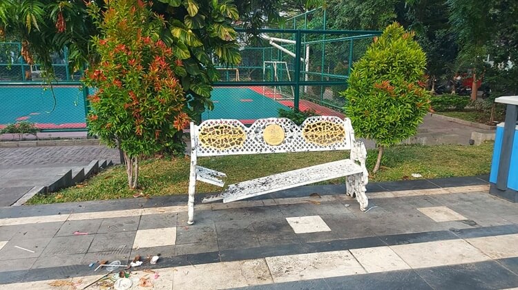 Kerusakan terlihat secara kasat mata tidak hanya terjadi pada tanaman, namun juga ada kursi dan lampu, yang berada di sekitar Taman Apsari.
