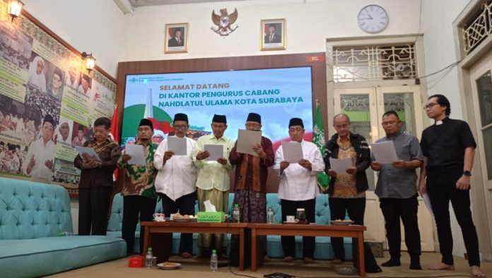 Surabaya, Nawacita – Pengurus Cabang Nahdlatul Ulama (PCNU) Kota Surabaya bersama tokoh lintas agama menggelar pernyataan sikap terkait perkembangan situasi sosial politik nasional, termasuk dinamika yang terjadi di Kota Surabaya. Acara ini berlangsung di Kantor PCNU Surabaya, Jalan Bubutan VI No. 2, pada Minggu (31/8/2025).