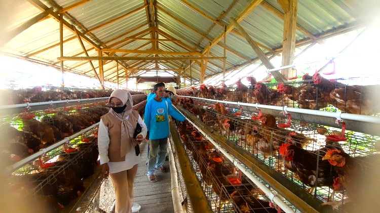 Bojonegoro, Nawacita – Di kandang ayam yang ada di area persawahan turut Desa Pancur, Kecamatan Temayang, Kabupaten Bojonegoro, Jawa Timur, tampak sekelompok orang berkaus biru sedang melihat suasana kandang. Beberapa di antaranya gantian masuk untuk melihat ayam-ayam yang sedang makan, dan di bawahnya ada telur-telur yang siap diambil.