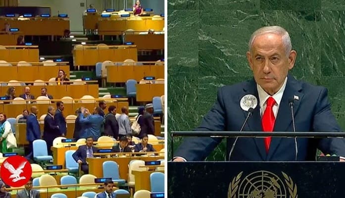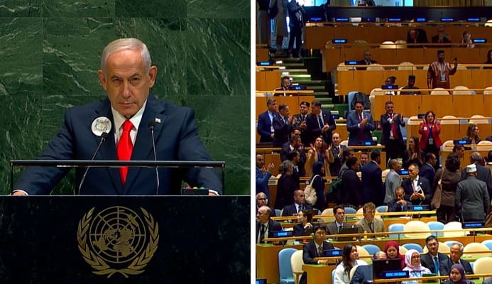 Pemandangan di ruang sidang utama PBB menunjukkan puluhan kursi kosong saat Netanyahu memulai pidatonya. Para diplomat yang keluar berasal dari negara-negara anggota Organisasi Kerja Sama Islam (OKI), Liga Arab, dan Gerakan Non-Blok.