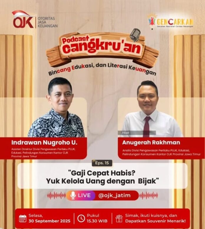 Surabaya, Nawacita.co – Otoritas Jasa Keuangan (OJK) Provinsi Jawa Timur kembali menghadirkan program edukasi keuangan Podcast Cangkru’an: Bincang Edukasi dan Literasi Keuangan. Pada edisi ke-15 yang digelar pekan ini, tema yang diangkat cukup dekat dengan keseharian masyarakat, yakni “Gaji Cepat Habis? Yuk Kelola Uang dengan Bijak.”