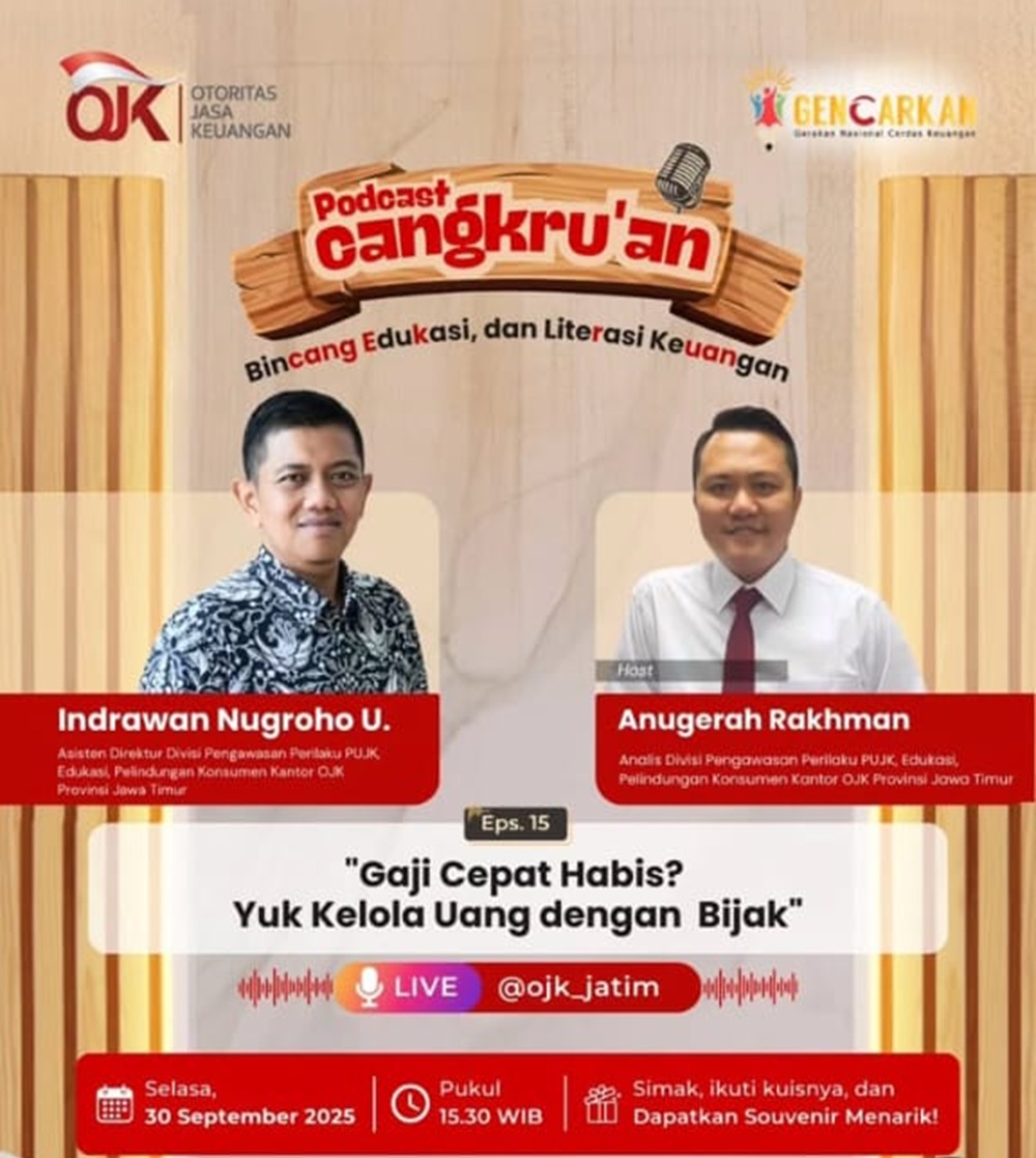 Podcast tersebut menghadirkan narasumber Indrawan Nugroho U., Asisten Direktur Divisi Pengawasan Perilaku PUJK, Edukasi, dan Perlindungan Konsumen OJK Jatim, serta dipandu oleh Anugerah Rakhman, Analis Divisi yang sama.