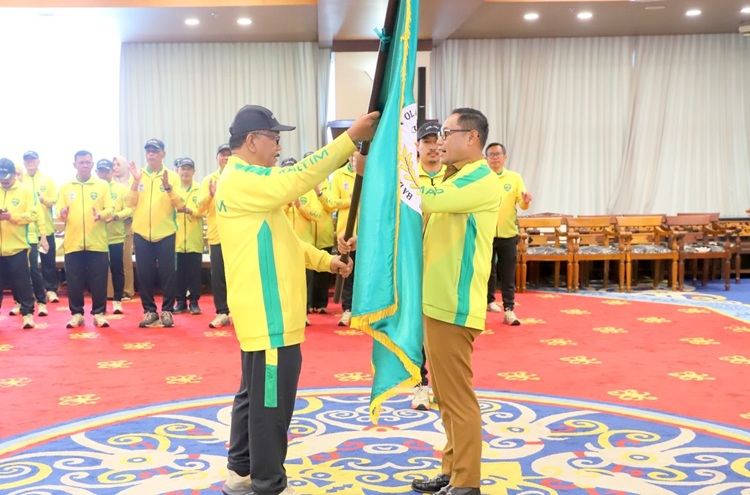 Samarinda, Nawacita | Wagub Kaltim H. Seno Aji melepas secara resmi Kontingen Kaltim yang akan mengikuti Pekan Olahraga Nasional (Pornas) Korpri XVII Tahun 2025 di Kota Palembang, Sumatera Selatan. Prosesi pelepasan berlangsung di halaman Ruang Ruhui Rahayu, Kantor Gubernur Kaltim, Selasa (30/9/2025).