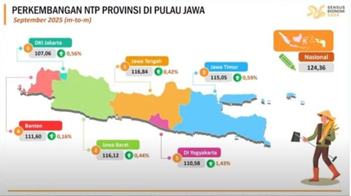 Semarang, Nawacita | Badan Pusat Statistik (BPS) Jawa Tengah menyebut Nilai Tukar Petani (NTP) Jawa Tengah pada September 2025 tertinggi di Pulau Jawa. Enam provinsi di Pulau Jawa secara keseluruhan mengalami kenaikan.